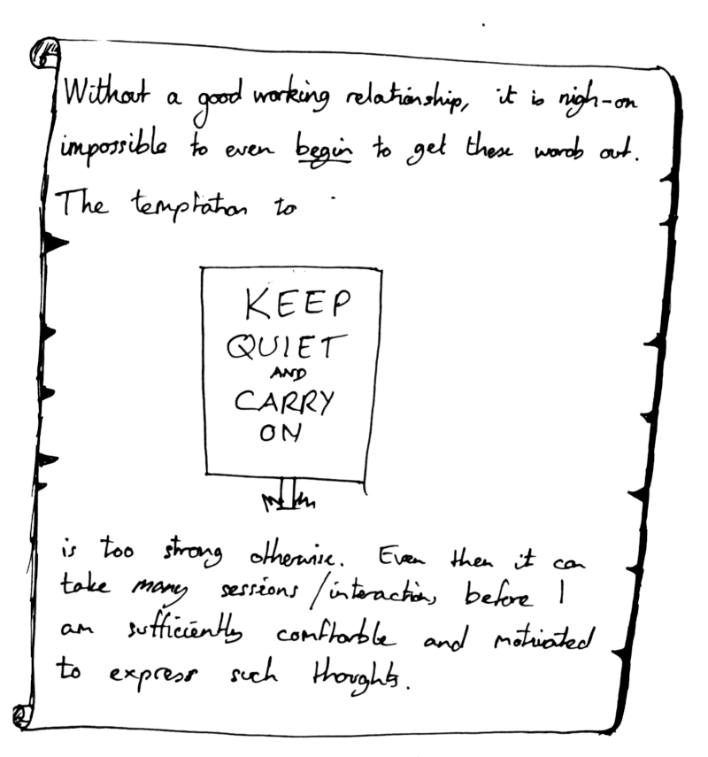 Even then it can take many sessions/interactions before I am sufficiently comfortable and motivated to express such thoughts.